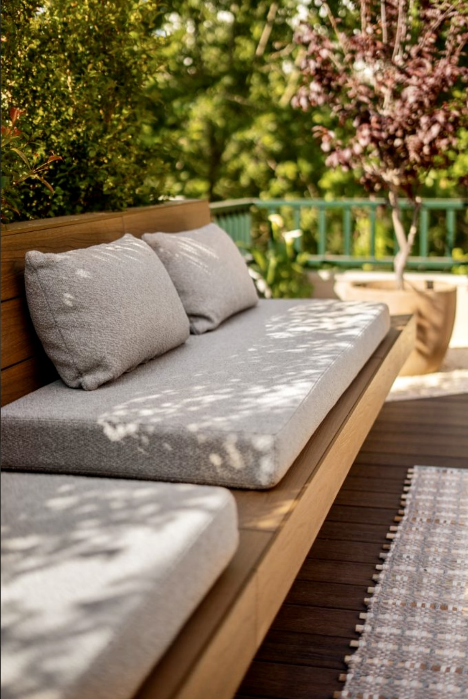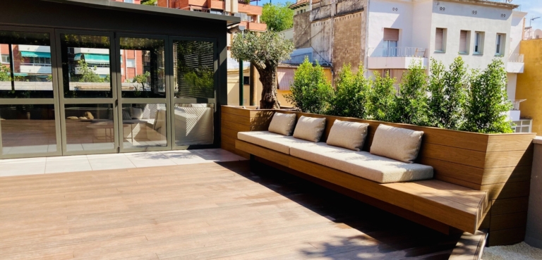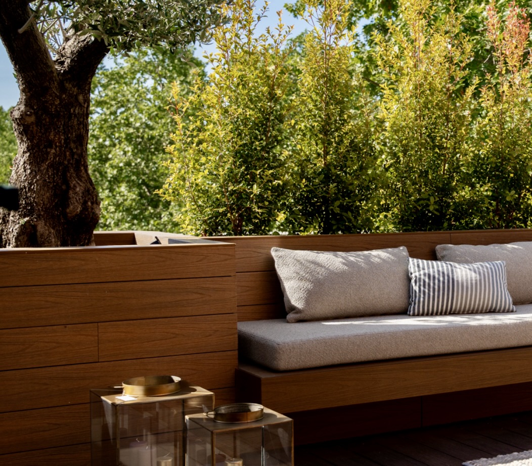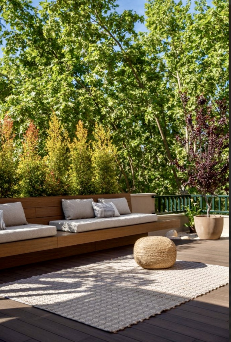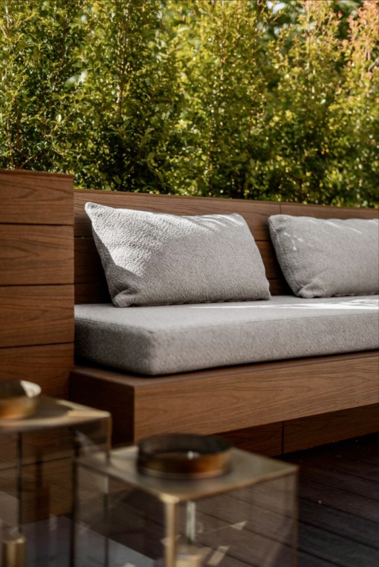 Els bancs correguts en fusta natural, el mobiliari a mida i l’encoixinat tèxtil aporten calidesa, mentre que el paisatgisme combina vegetació filtrant, pedra blanca i arbres en test per afavorir la privacitat.
