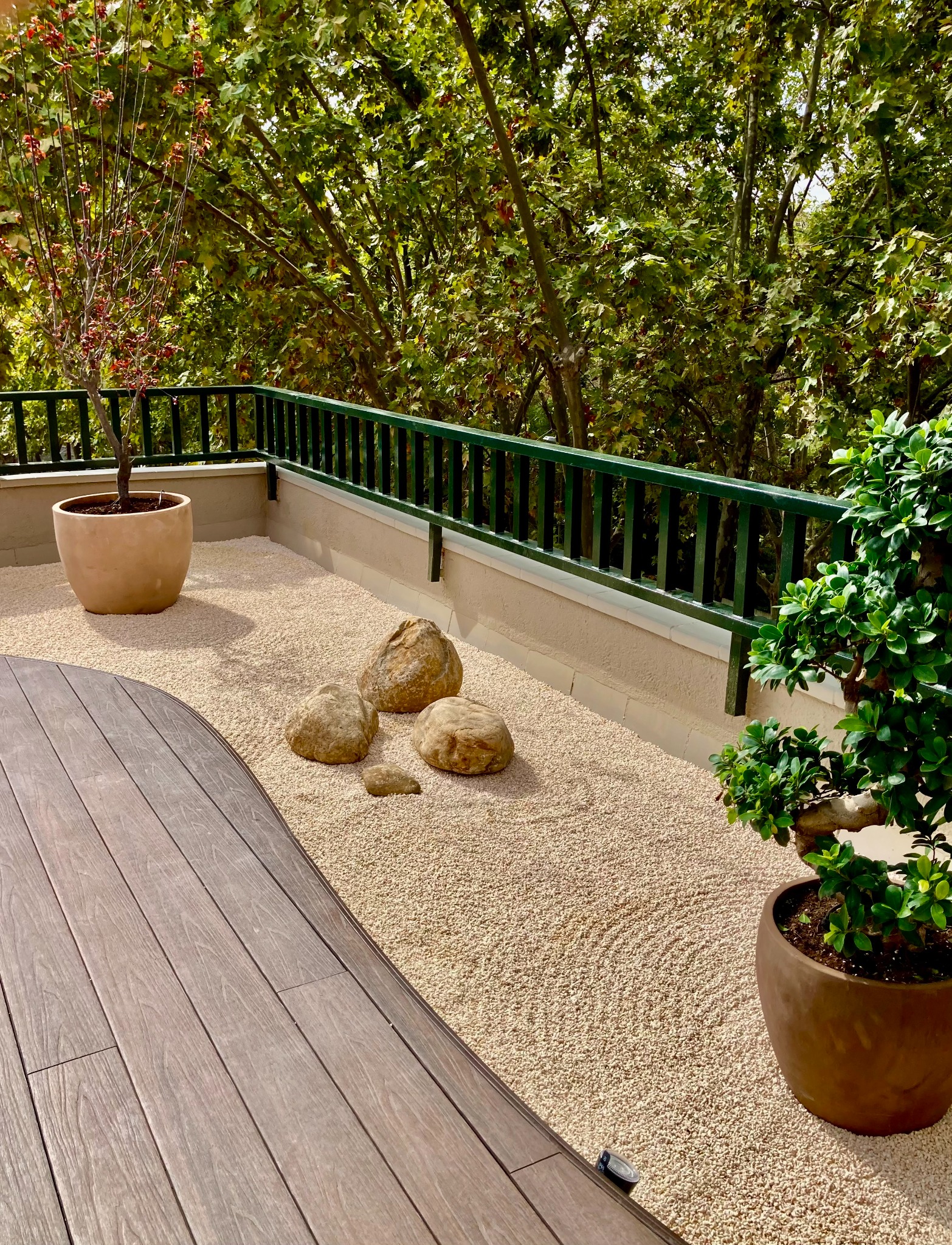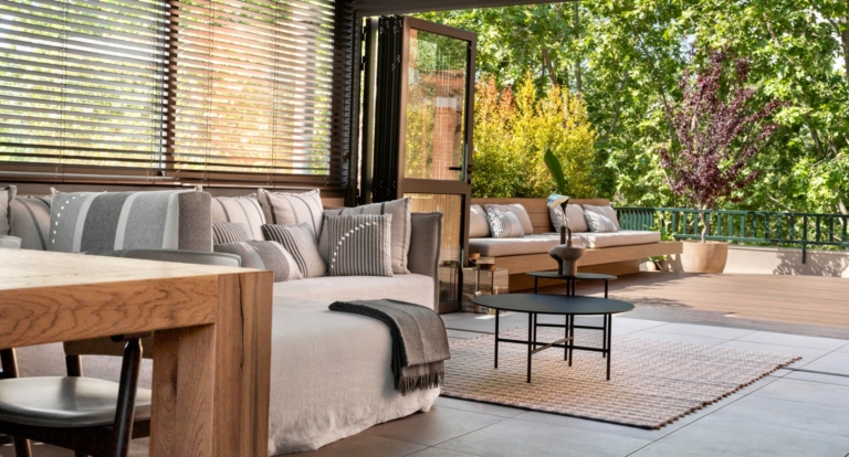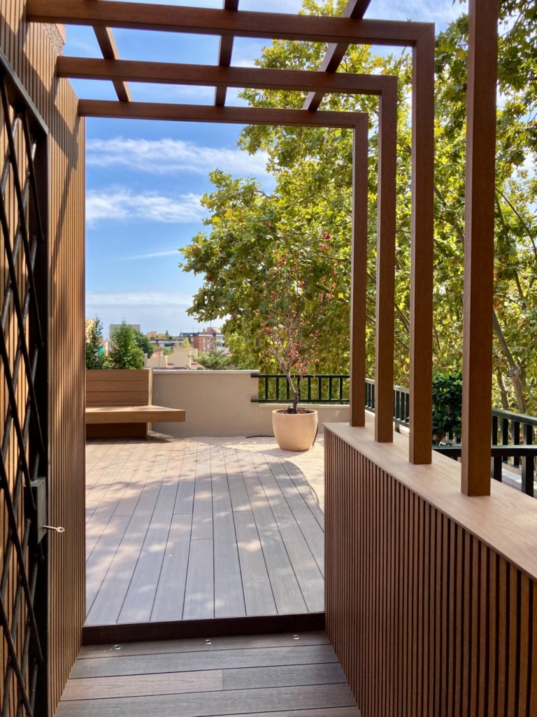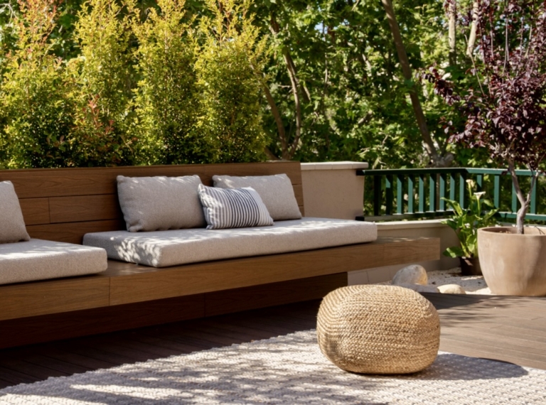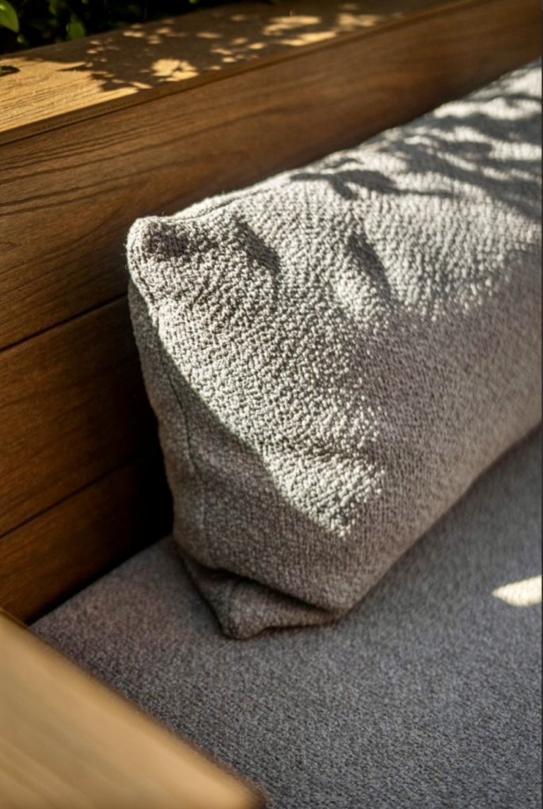 Els bancs correguts en fusta natural, el mobiliari a mida i l’encoixinat tèxtil aporten calidesa, mentre que el paisatgisme combina vegetació filtrant, pedra blanca i arbres en test per afavorir la privacitat.