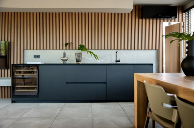 Quan els tancaments s’obren completament, l’interior i l’exterior es confonen, i la paret de làmines de fusta, que actua com a filtre visual cap al bany, reforça aquesta continuïtat material i formal.