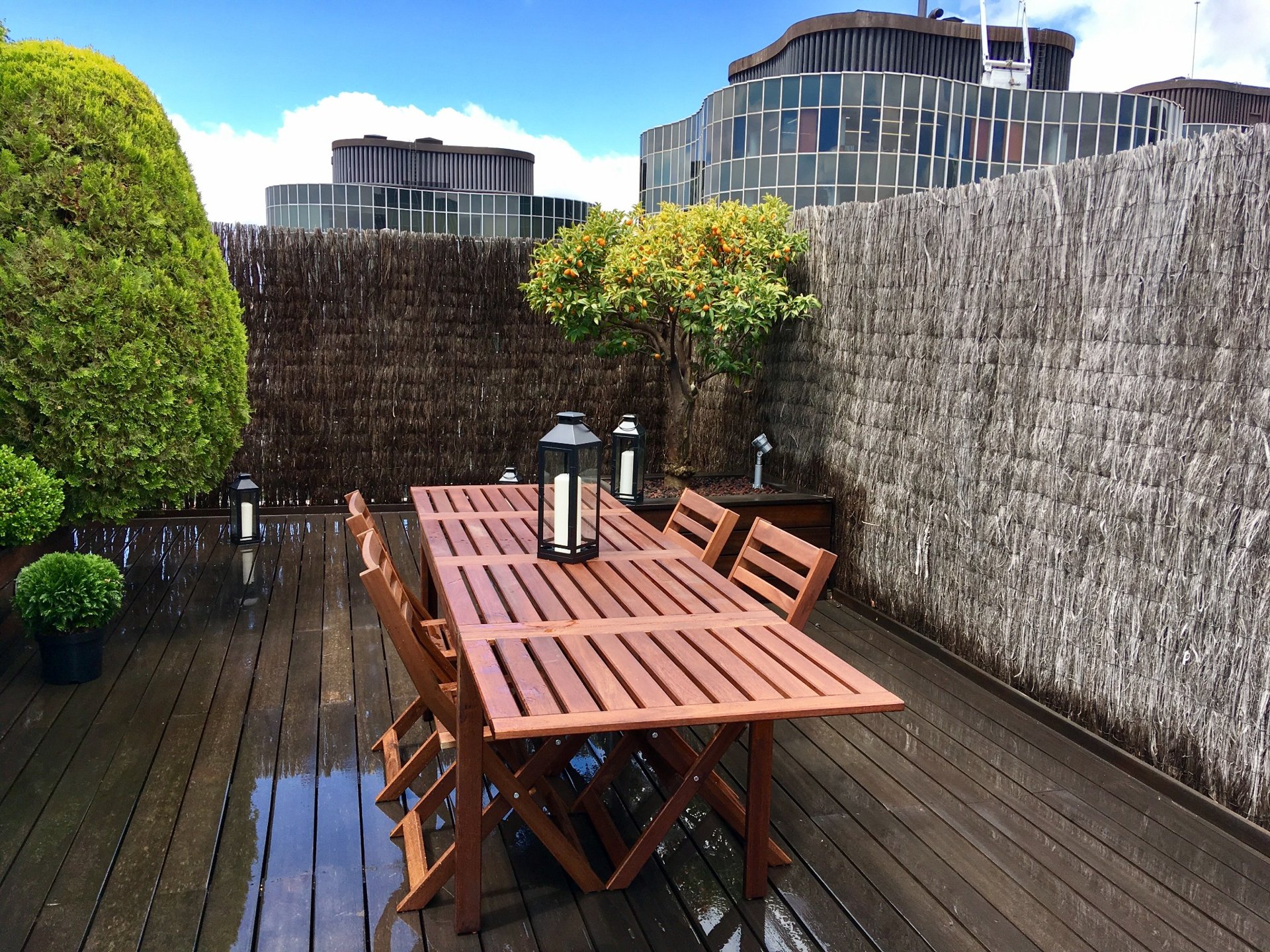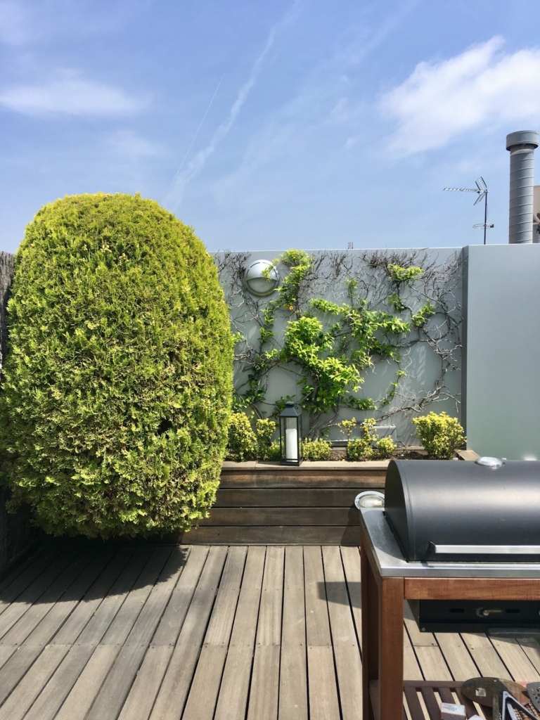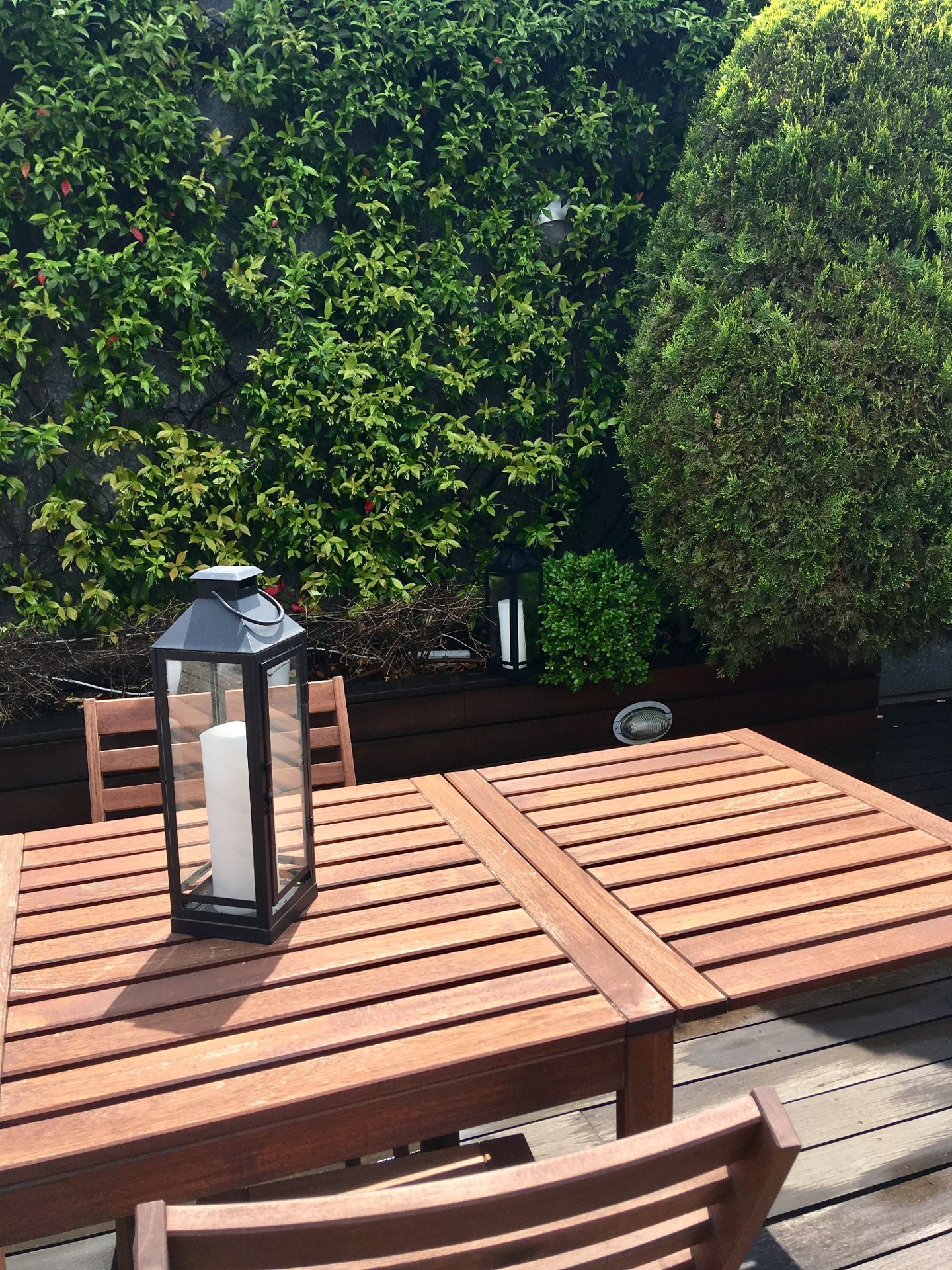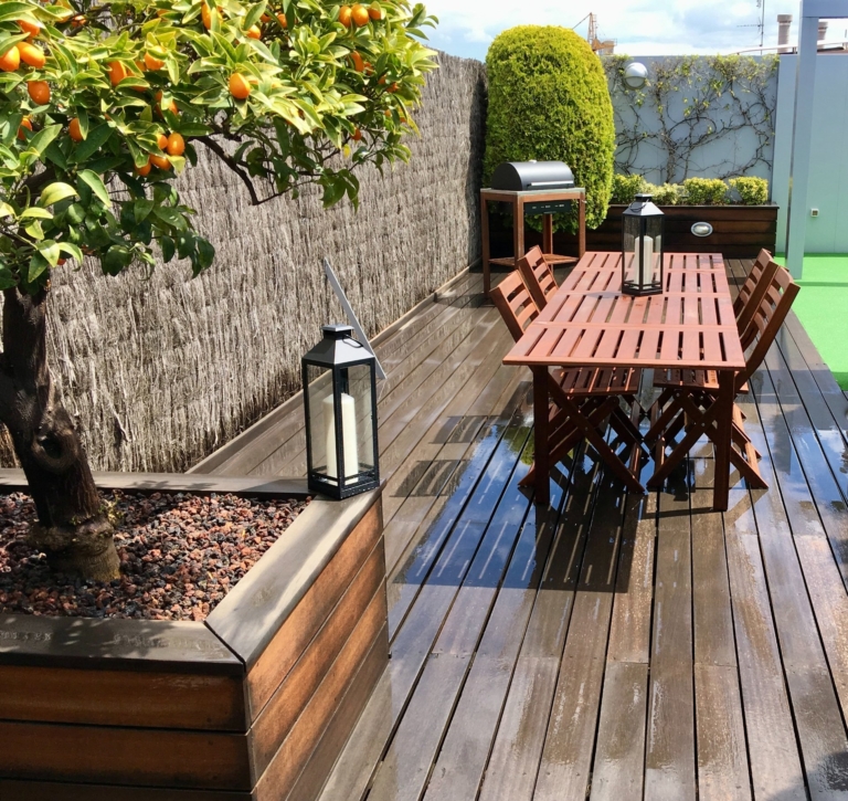 Aquest projecte transforma completament una terrassa urbana a l’última planta d’un edifici de l’Avinguda Diagonal de Barcelona. L’actuació es basa en una selecció acurada de materials càlids i vegetació persistent, buscant una sensació d’aire lliure domèstic i natural. El paviment de fusta sintètica unifica l’espai, mentre que els parterres elevats i la jardineria vertical generen verdor sense perdre intimitat. S’hi incorpora una zona de menjador a l’aire lliure amb mobiliari de fusta, il·luminació puntual i una barbacoa funcional. L’ús de fanalets i llum ambiental aporta calidesa al capvespre i nocturnitat a l’espai.