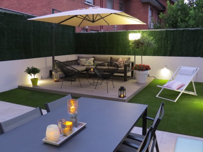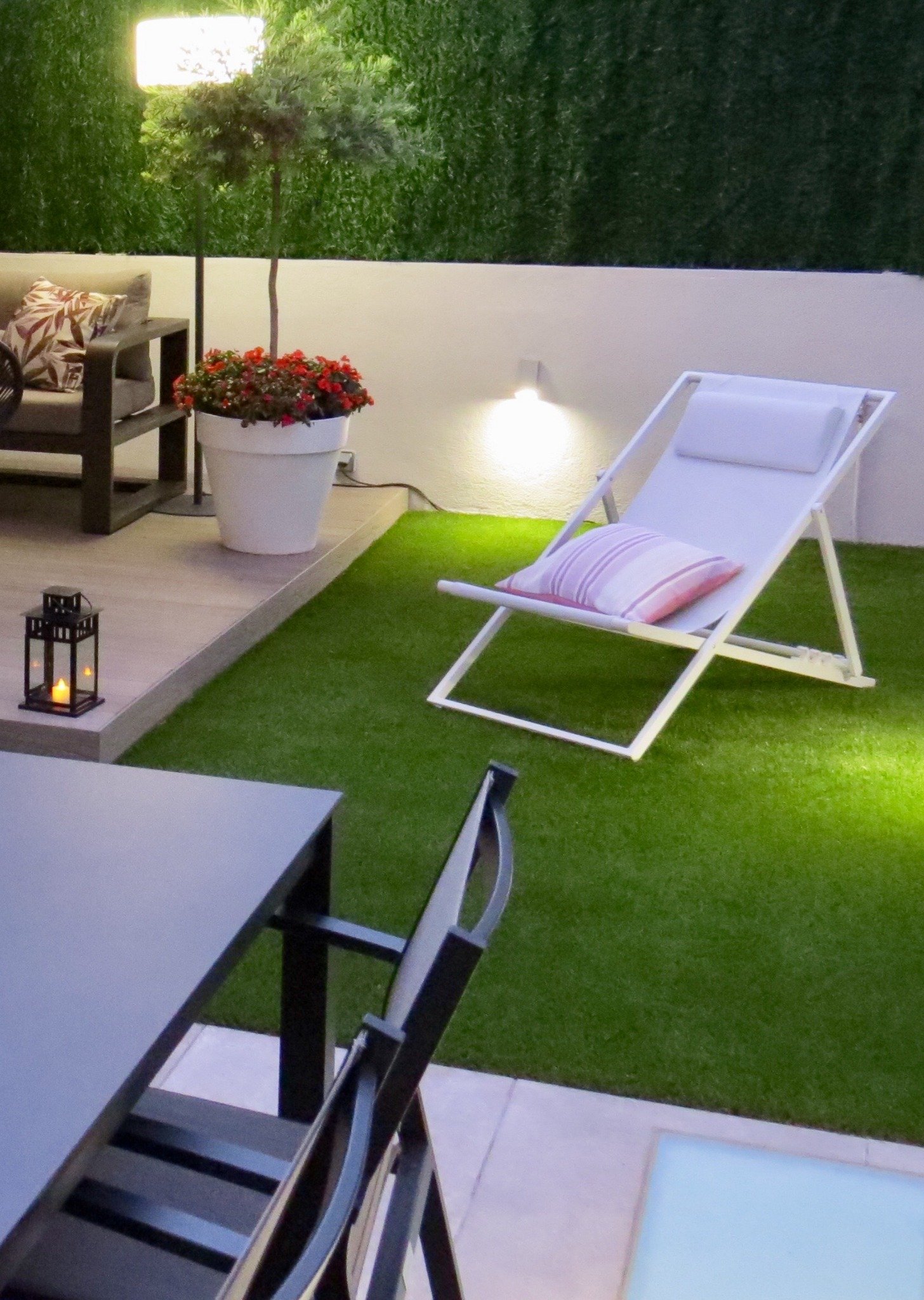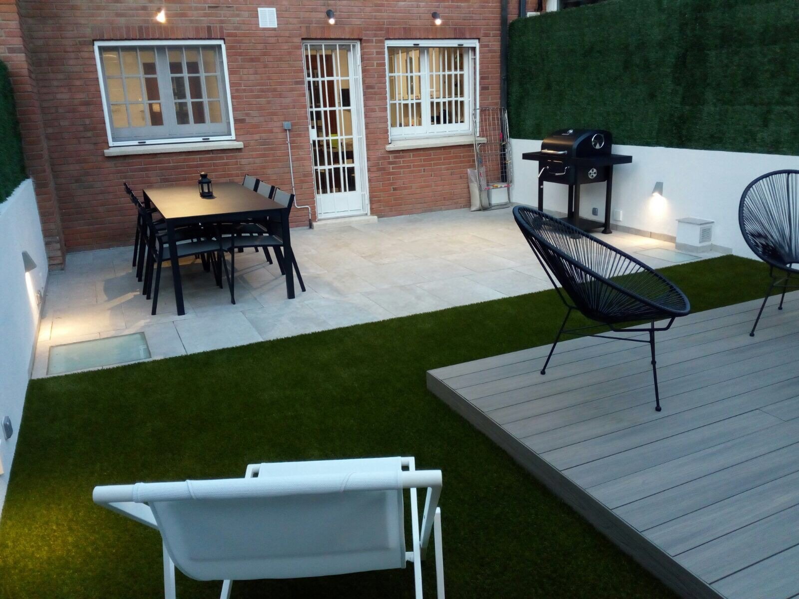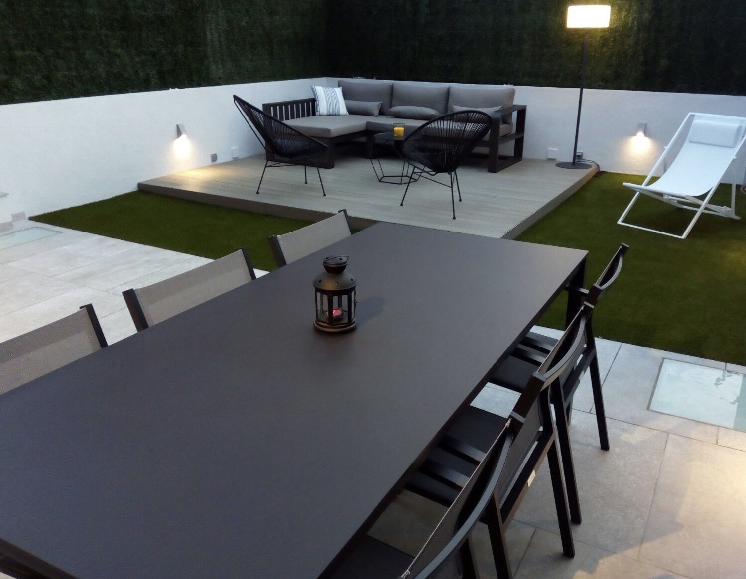 Aquest projecte transforma una terrassa privada en un escenari de confort i contemplació a Sitges. El disseny articula diferents ambients mitjançant una plataforma de fusta tecnològica que delimita la zona de descans. Els sofàs de línies rectes i tons neutres conviuen amb una il·luminació tèbia i puntual, llanternes i punts de llum encastats que generen una atmosfera càlida i funcional. La zona de menjador s’obre sobre una superfície de ceràmica clara, mentre que el jardí artificial i la vegetació en testos arrodoneixen el conjunt amb un toc natural. Una barbacoa i detalls decoratius completen aquest espai fet a mida per a gaudir-lo amb intimitat