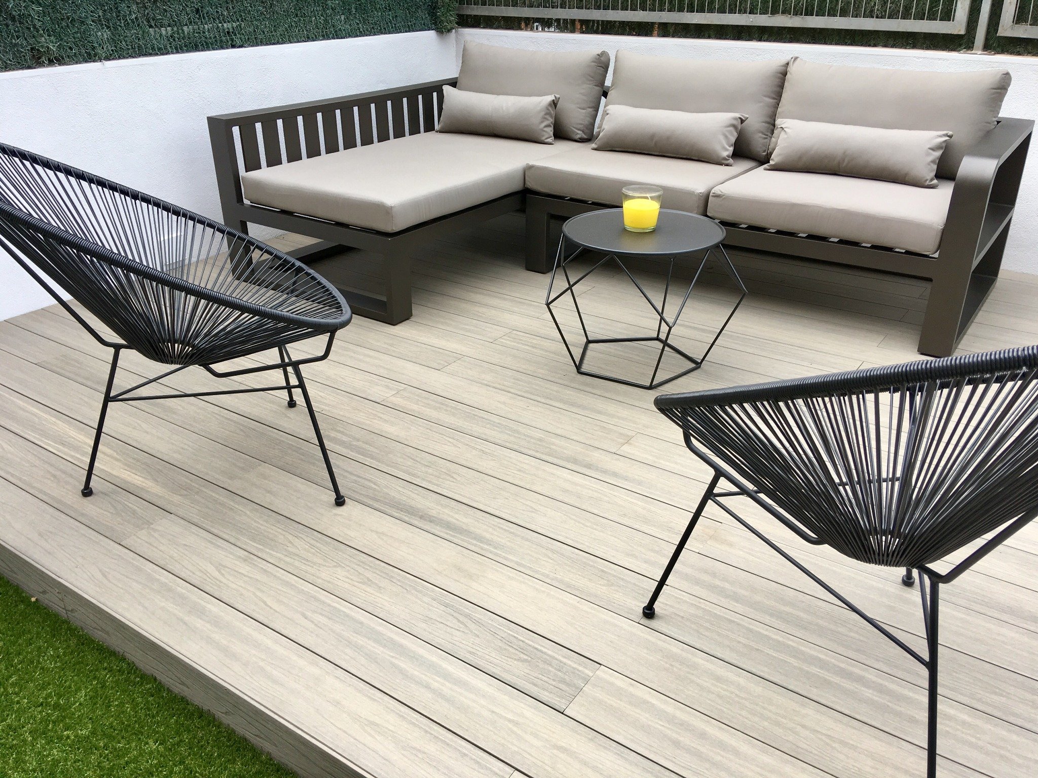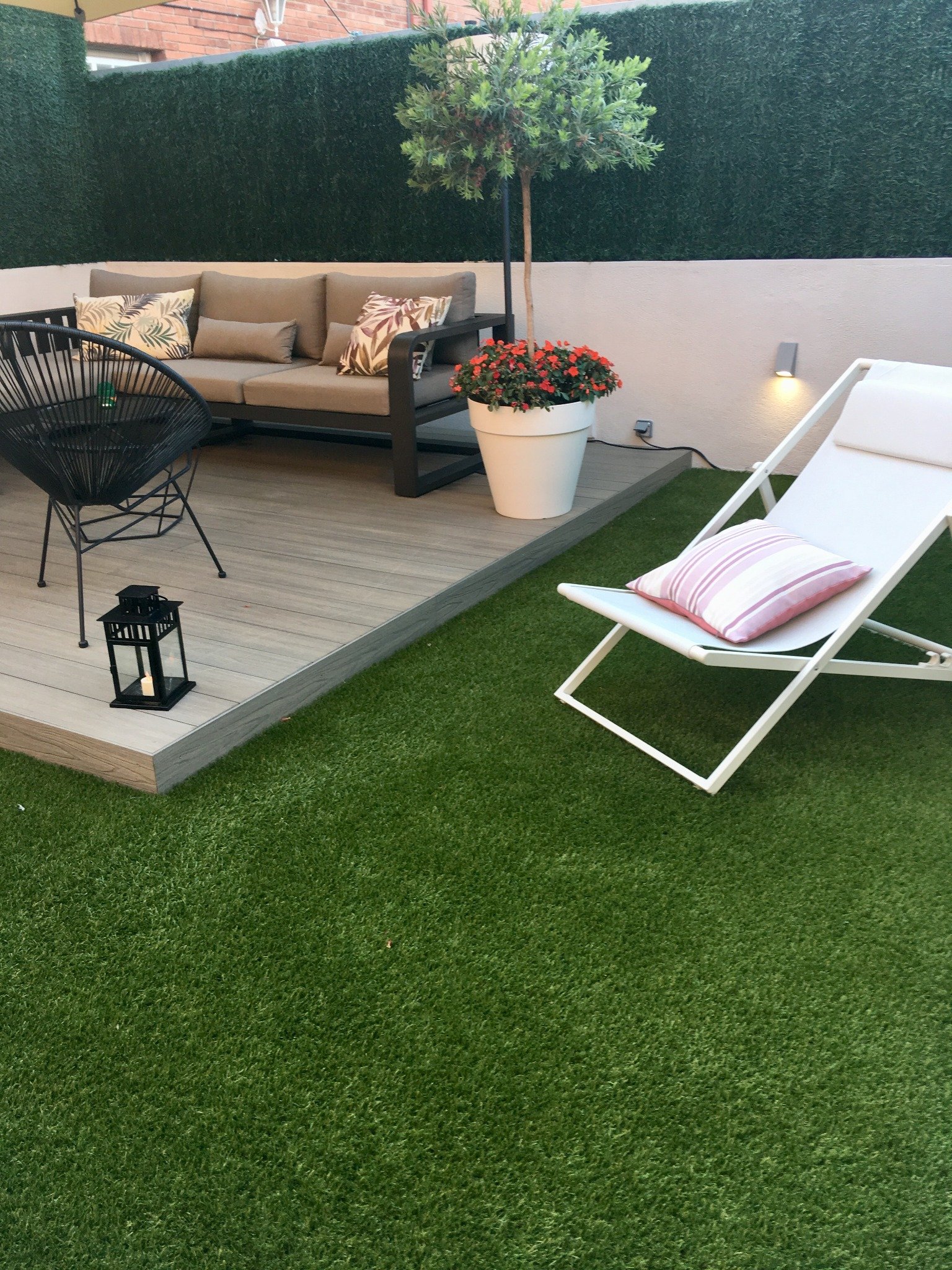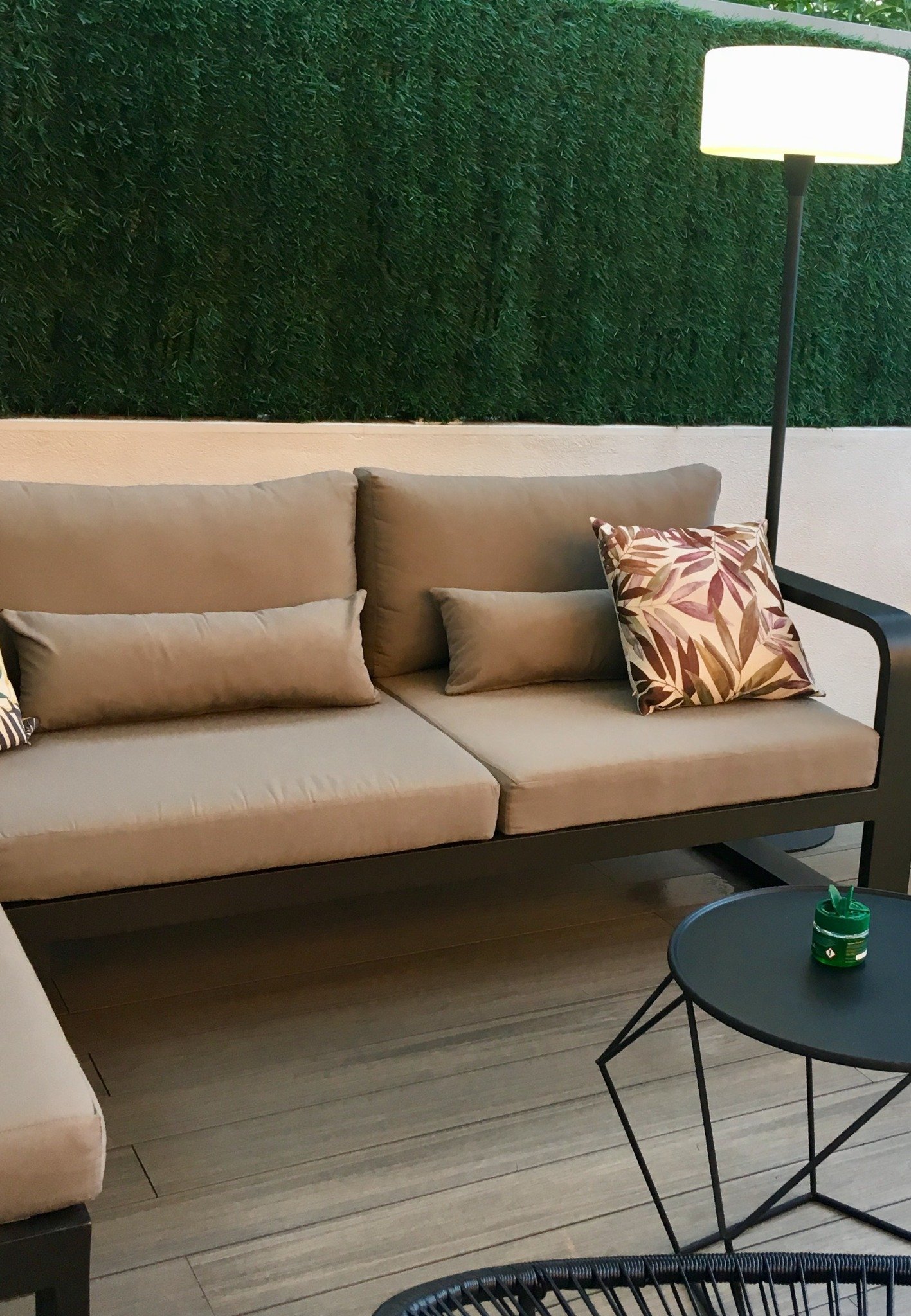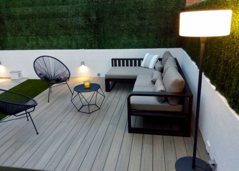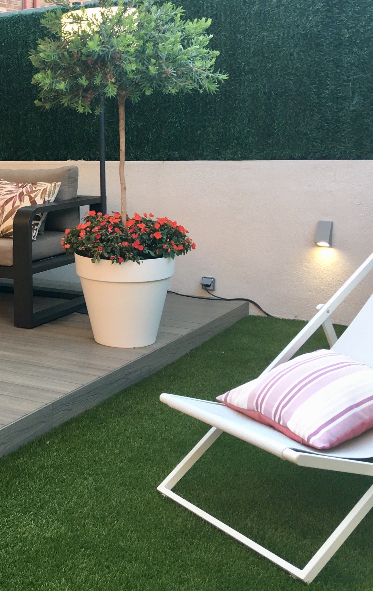 Aquest projecte transforma una terrassa privada en un escenari de confort i contemplació a Sitges. El disseny articula diferents ambients mitjançant una plataforma de fusta tecnològica que delimita la zona de descans. Els sofàs de línies rectes i tons neutres conviuen amb una il·luminació tèbia i puntual, llanternes i punts de llum encastats que generen una atmosfera càlida i funcional. La zona de menjador s’obre sobre una superfície de ceràmica clara, mentre que el jardí artificial i la vegetació en testos arrodoneixen el conjunt amb un toc natural. Una barbacoa i detalls decoratius completen aquest espai fet a mida per a gaudir-lo amb intimitat