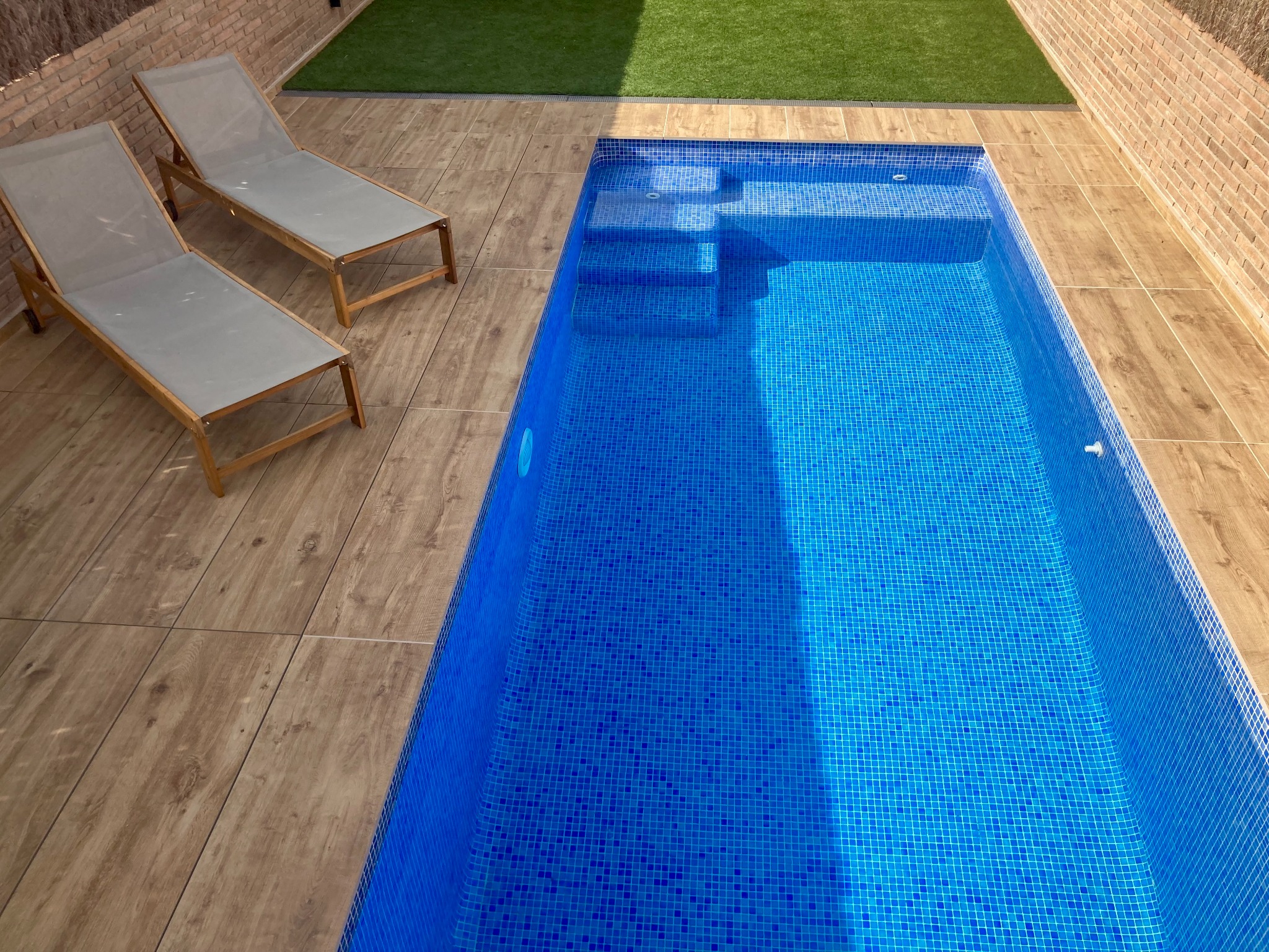 El disseny del paviment, en gres porcelànic amb textura de fusta natural, connecta visualment l’àrea de menjador exterior, la zona de relax i l’accés a la piscina, aportant continuïtat i calidesa. El mobiliari i les lluminàries de fibres naturals completen l’ambient amb un llenguatge suau i acollidor.