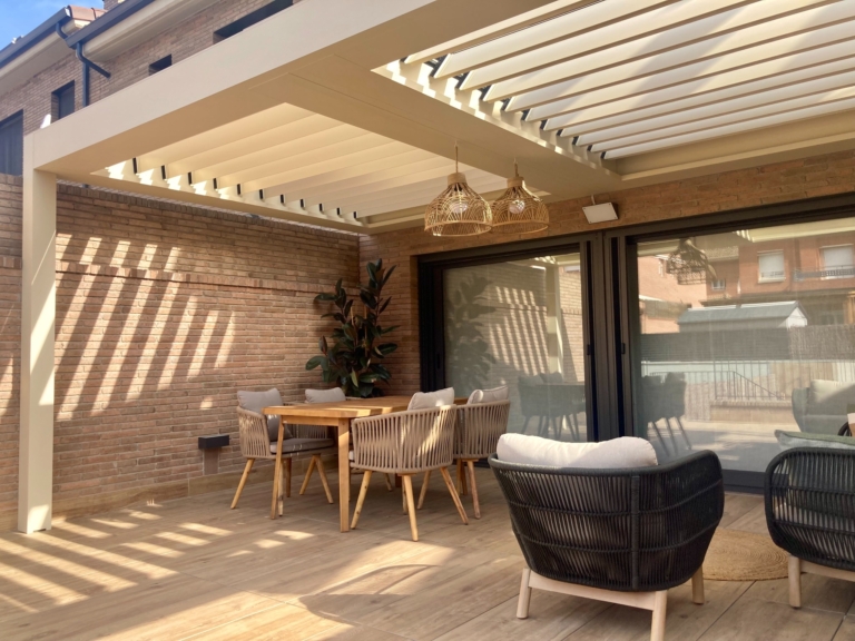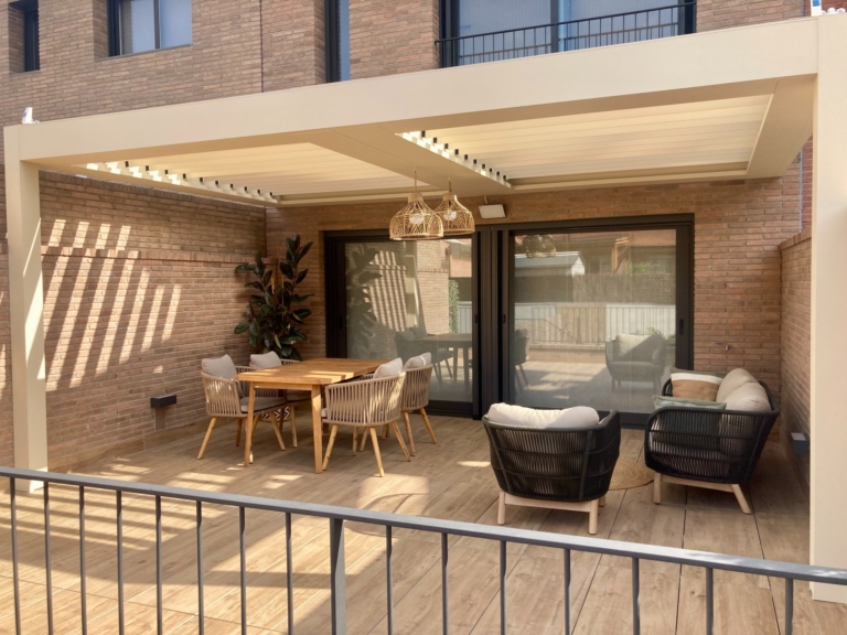 Aquest projecte transforma una zona exterior privada en un espai elegant, funcional i confortable per a totes les estacions. El punt central de la intervenció és la instal·lació d’una pèrgola bioclimàtica orientable i retràctil, que regula la llum i protegeix del vent i la pluja sense renunciar a l’obertura total de l’espai.