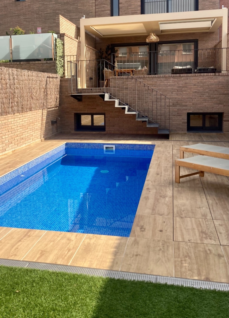 Intervenció: Pèrgola bioclimàtica orientable i retràctil, paviment porcelànic, piscina, escales, mobiliari, il·luminació i jardineria