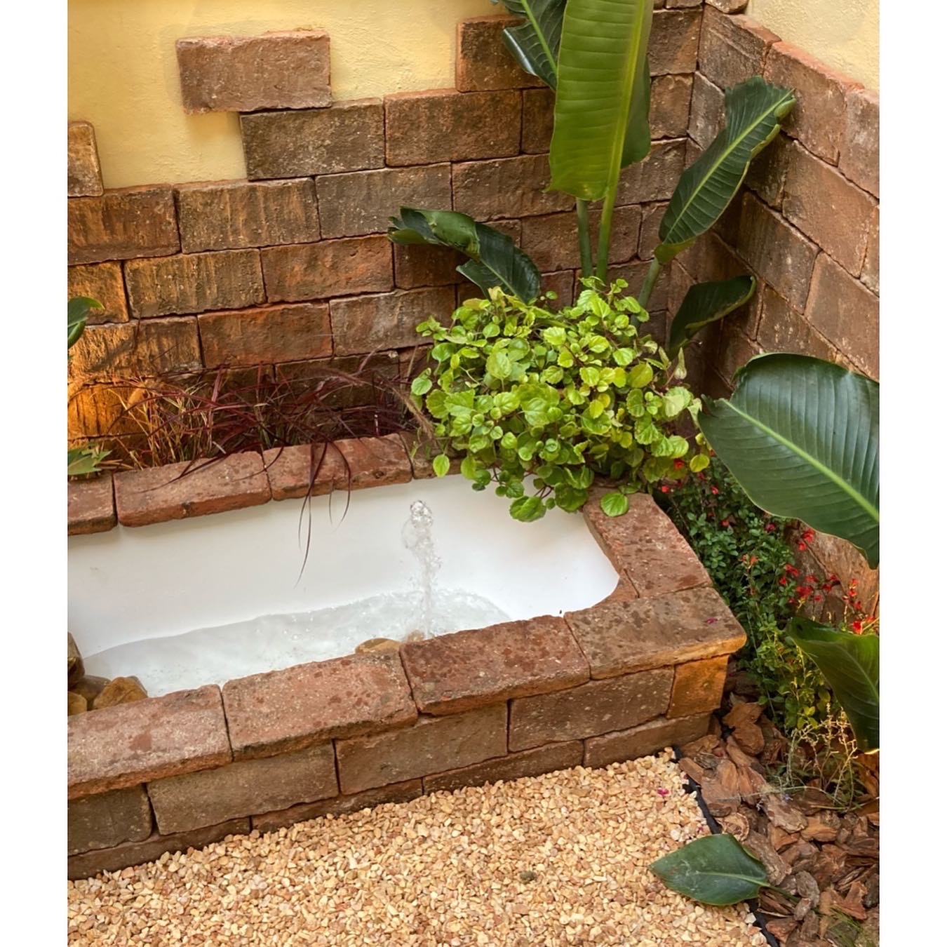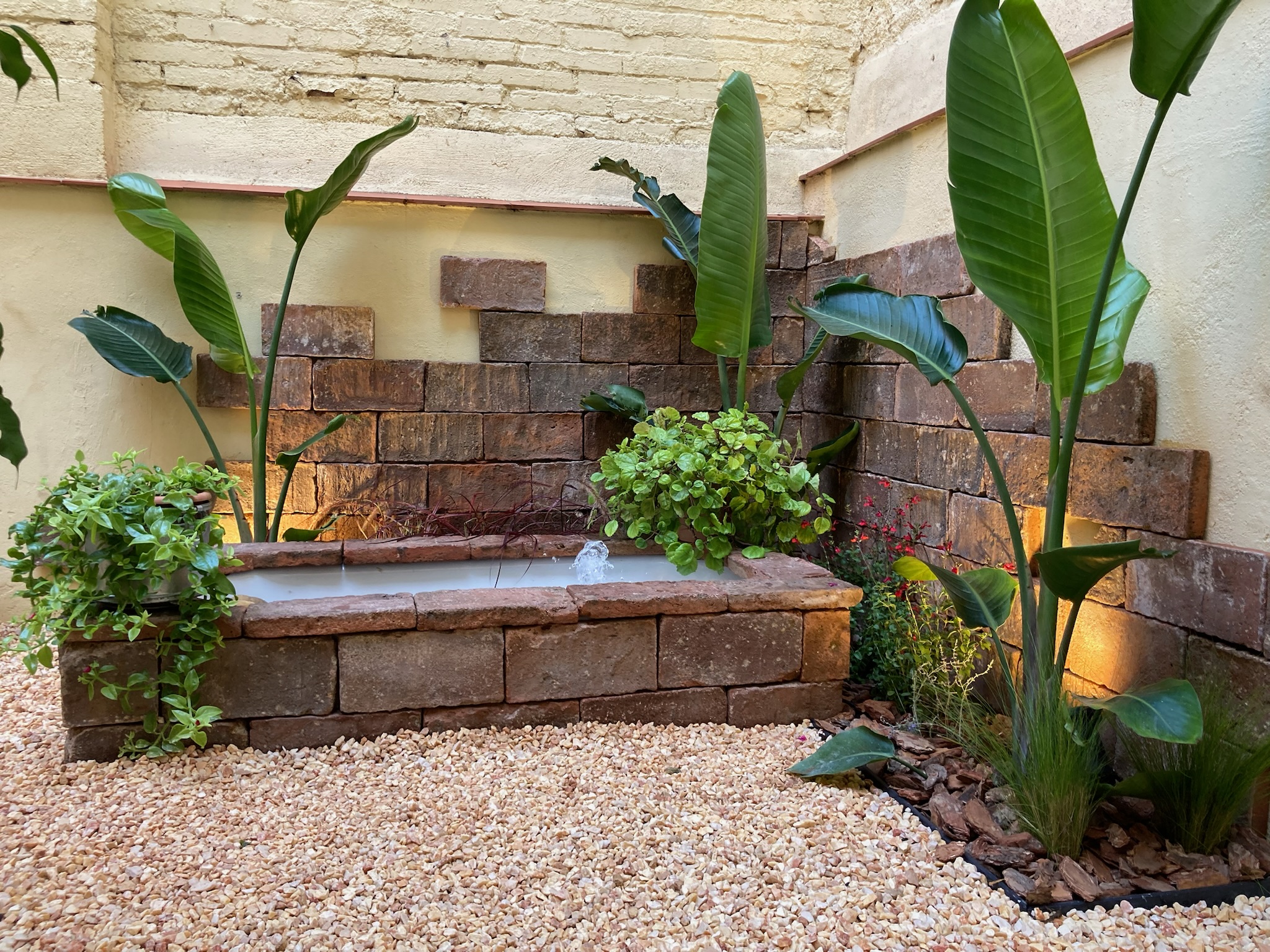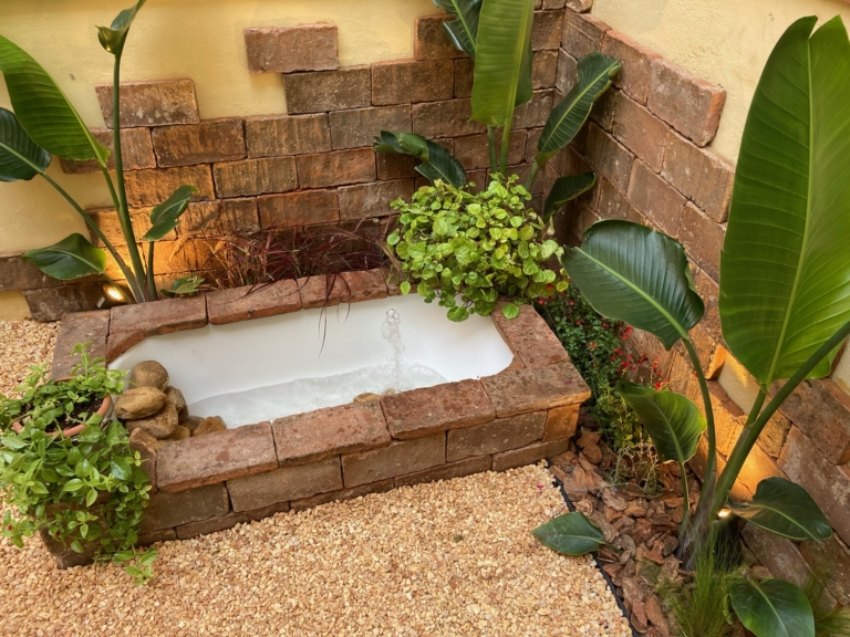 El protagonisme d’una antiga banyera reconvertida en font ornamental aporta caràcter i singularitat a l’espai, mentre que la il·luminació subtil reforça les textures i amplia l’experiència nocturna.